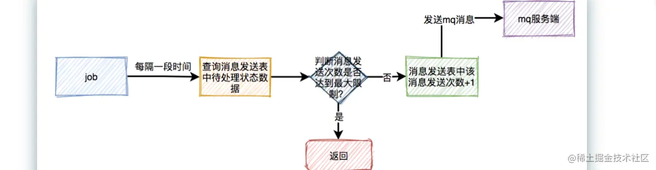 每次在job重试时,需要先判断一下消息发送表中该消息的发送次数是否达到最大限制,如果达到了,则直接返回。如果没有达到,则将次数加1,然后发送消息。