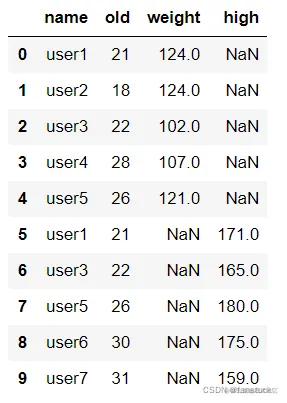该为交集则根据index合并,若没有的索引值则会自动NaN填补:
