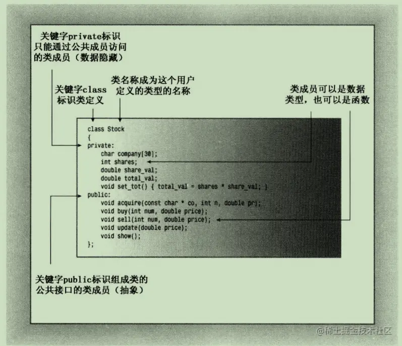 类表示人们可以通过类方法的公有接口对类对象执行的操作,这是抽象。类的数据成员可以是私有的(默认值),这意味着只能通过成员函数来访问这些数据,这是数据隐藏。实现的具体细节(如数据表示和方法的代码)都是隐藏的,这是封装。