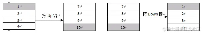 特殊翻页:屏幕显示的是第一页(即显示第1 – 4首)时,光标在第一首歌曲上,用户按Up键后,屏幕要显示最后一页(即显示第7-10首歌),同时光标放到最后一首歌上。同样的,屏幕显示最后一页时,光标在最后一首歌曲上,用户按Down键,屏幕要显示第一页,光标挪到第一首歌上。