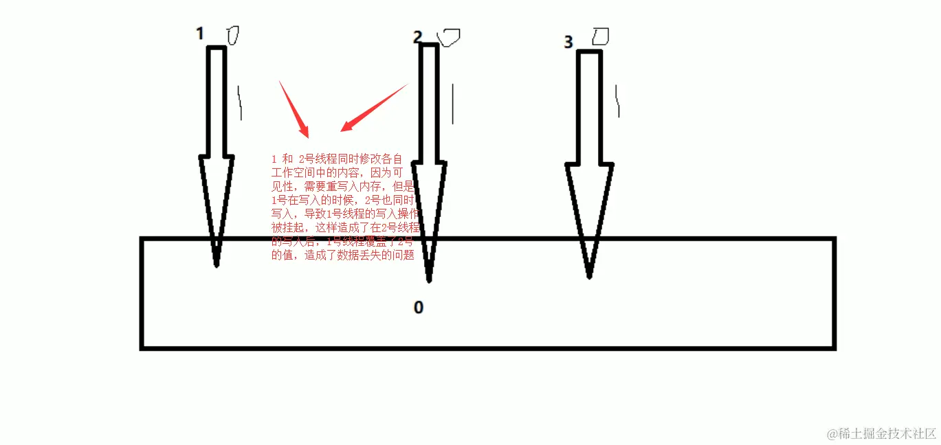 各自线程在写入主内存的时候,出现了数据的丢失,而引起的数值缺失的问题