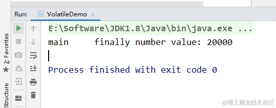 // 假设volatile保证原子性,那么输出的值应该为: 20 * 1000 = 20000
