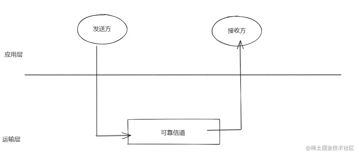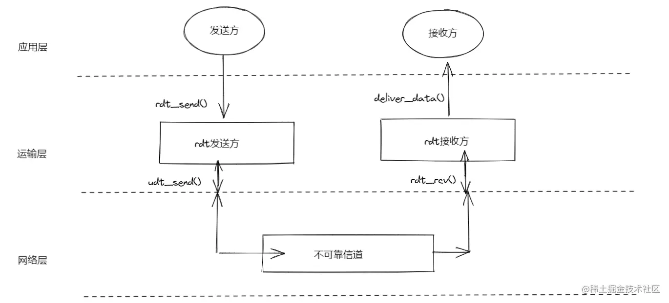 但刚刚提到过,网络层IP协议提供的是不可靠的服务,所以在运输层中,我们需要实现一些协议,来把不可靠的数据传输变为可靠的数据传输,这个协议就是可靠数据传输协议(rdt) 。我们还是以应用层,运输层,网络层为例: