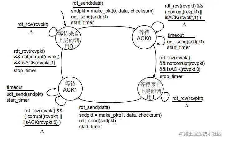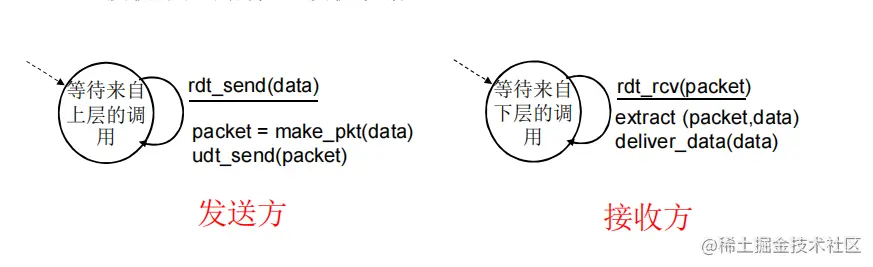 - rdt的发送方和接收方都需调用udt_send() 发送分组给对方(udt为不可靠数据传输)