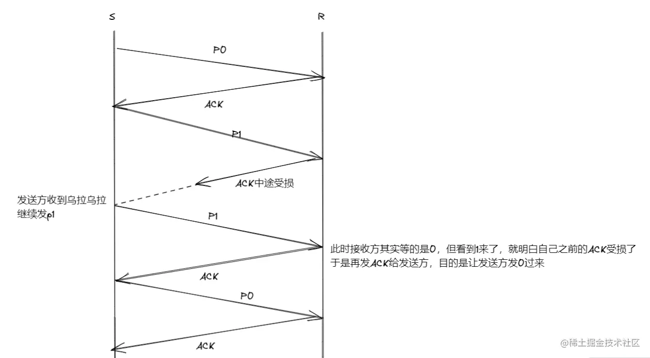 - 在等0的时候收到了1(左二行),则发送ACK给发送方,因为只有这样发送方才能发1