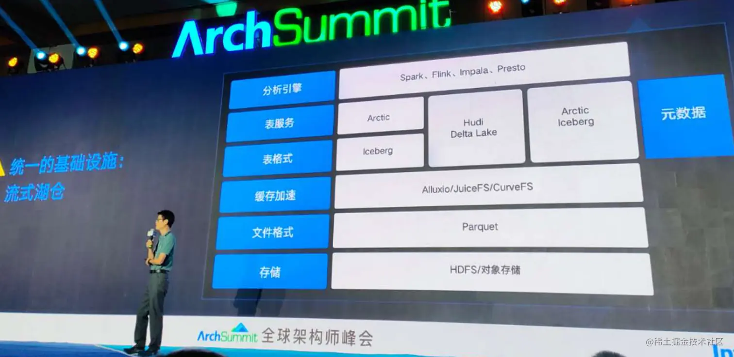 存储方面有HDFS和对象存储,计算的工具有MapReduce、YARN/K8s,数据格式的助力有Parquet,Catalog主要为HMS,SQL引擎中间件有Impala、SparkSQL、Presto,流计算的中间件Kafka、PULSAR、Flink被广泛使用。