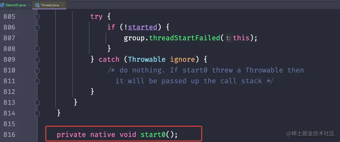 Thread在拿到这个对象的时候,当我们执行Thread的start方法的时候,会执行到一个native方法start0: