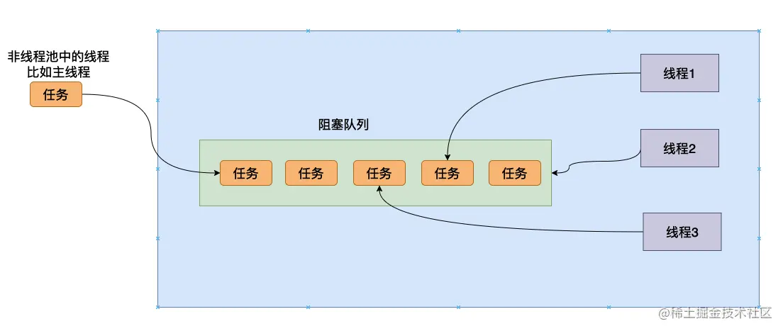 从上图可以看到我们需要两次的上下文切换,同时还需要执行一些操作系统的函数,这个过程是非常耗时间的,如果在并发非常高的情况,我们频繁的去生成线程然后销毁,这对我们程序的性能影响还是非常大的。因此许许多多聪明的程序员就想能不能不去频繁的创建线程而且也能够完成我们的功能——我们创建线程的目的就是想让我们的程序完成的更加快速,让多个不同的线程同时执行不同的任务。于是线程池就被创造出来了。线程池的结构大致如下所示: