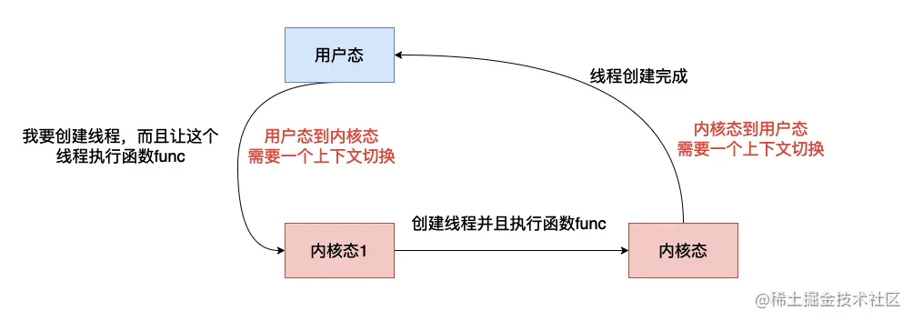上面我们已经谈到了,当我们执行start的方法的时候,最终会走到start0方法,这是一个native方法,JVM在执行这个方法的时候会通过系统底层函数创建一个线程,然后去执行run方法,这里需要注意,创建线程是需要系统资源的,比如说内存,因为操作系统是系统资源的管理者,因此一般需要系统资源的方法都需要操作系统的参与,因此创建线程需要操作系统的帮忙,而一旦需要操作系统介入,执行代码的状态就需要从用户态到内核态转换(内核态能够执行许多用户态不能够执行的指令),当操作系统创建完线程之后有需要返回用户态,我们的代码将继续被执行,整个过程像下面这样。