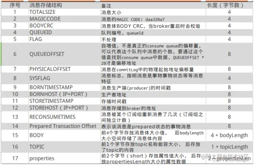 CommitLog的消息存储单元长度不固定,文件顺序写,随机读。消息的存储结构如下,按照编号顺序以及编号对应的内容依次存储。