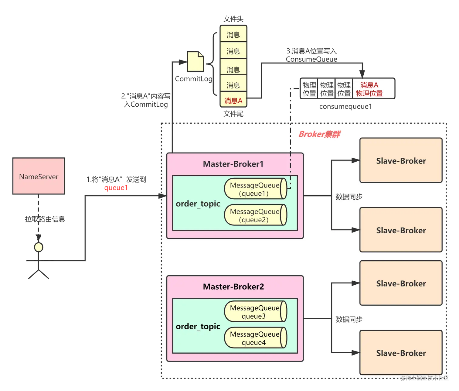 假设order_topic在Broker集群共有4个MessageQueue:queue1、queue2、queue3、queue4,均匀分布在两个Master-Broker,Pro选择queue1这个MessageQueue发了条“消息A”,则: