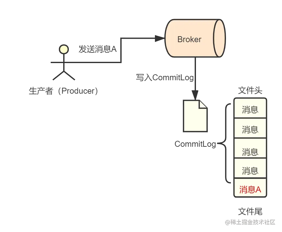 - 首先M-Broker接收到消息A后,将其内容顺序写入自己机器的CommitLog文件末尾