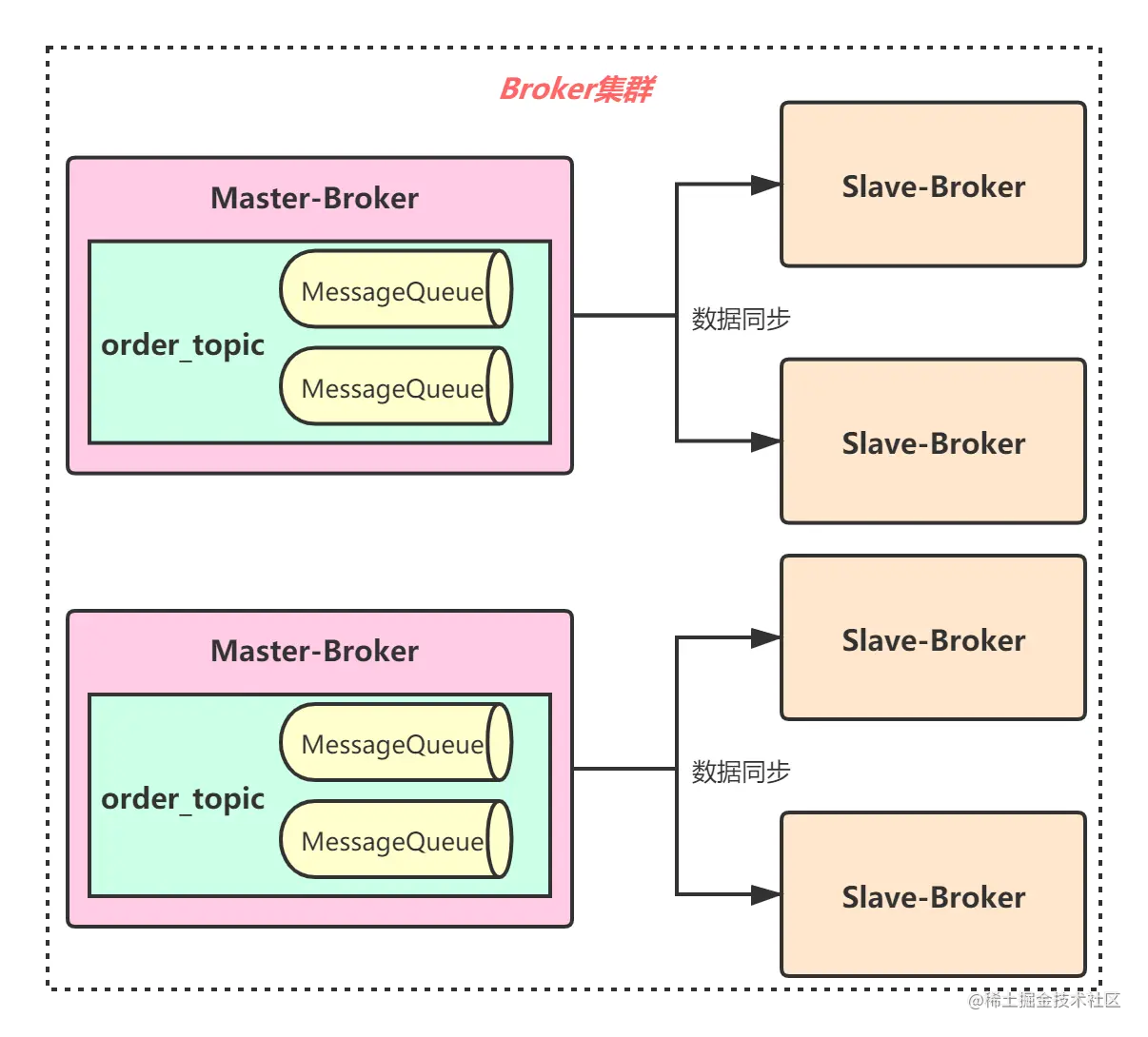 MessageQueue是个数据分片机制。如order_topic共1万条消息,可大致认为每个MessageQueue保存2500条消息。但并非绝对,需根据Pro写消息的策略。暂认为消息是在MessageQueue平均分配,然后MessageQueue也可能平均分布在Master-Broker:
