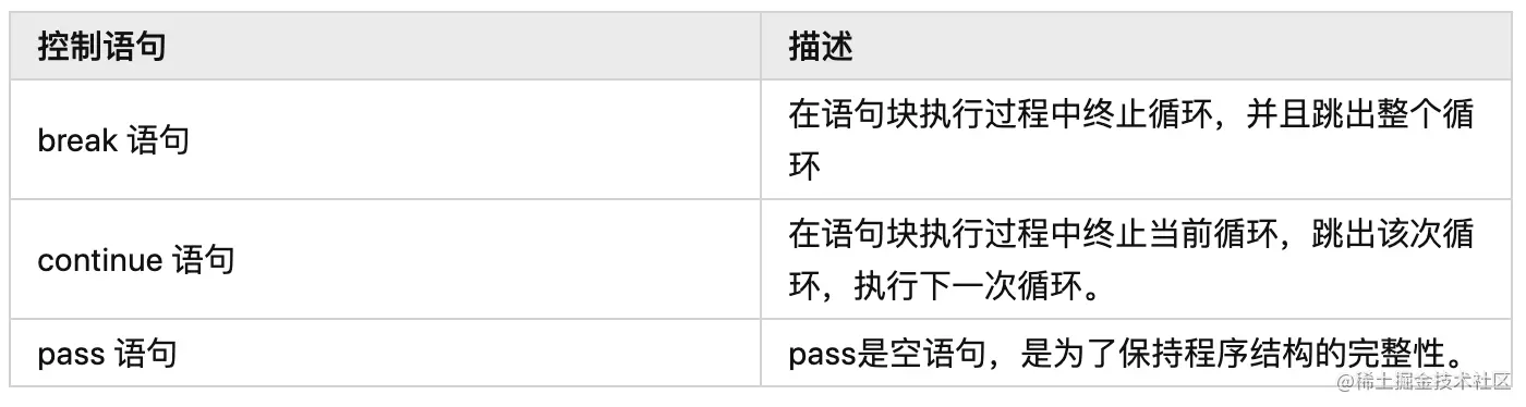 循环控制语句可以更改语句执行的顺序。Python支持以下循环控制语句: