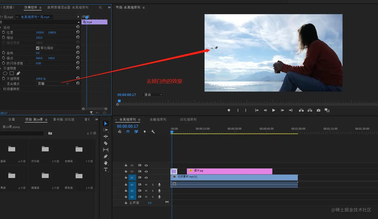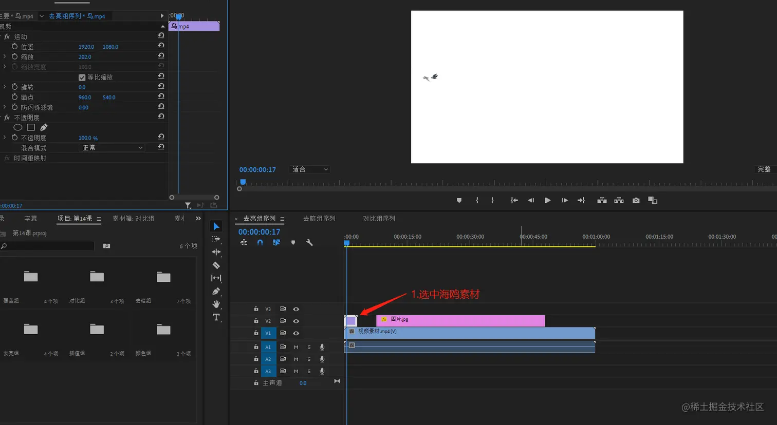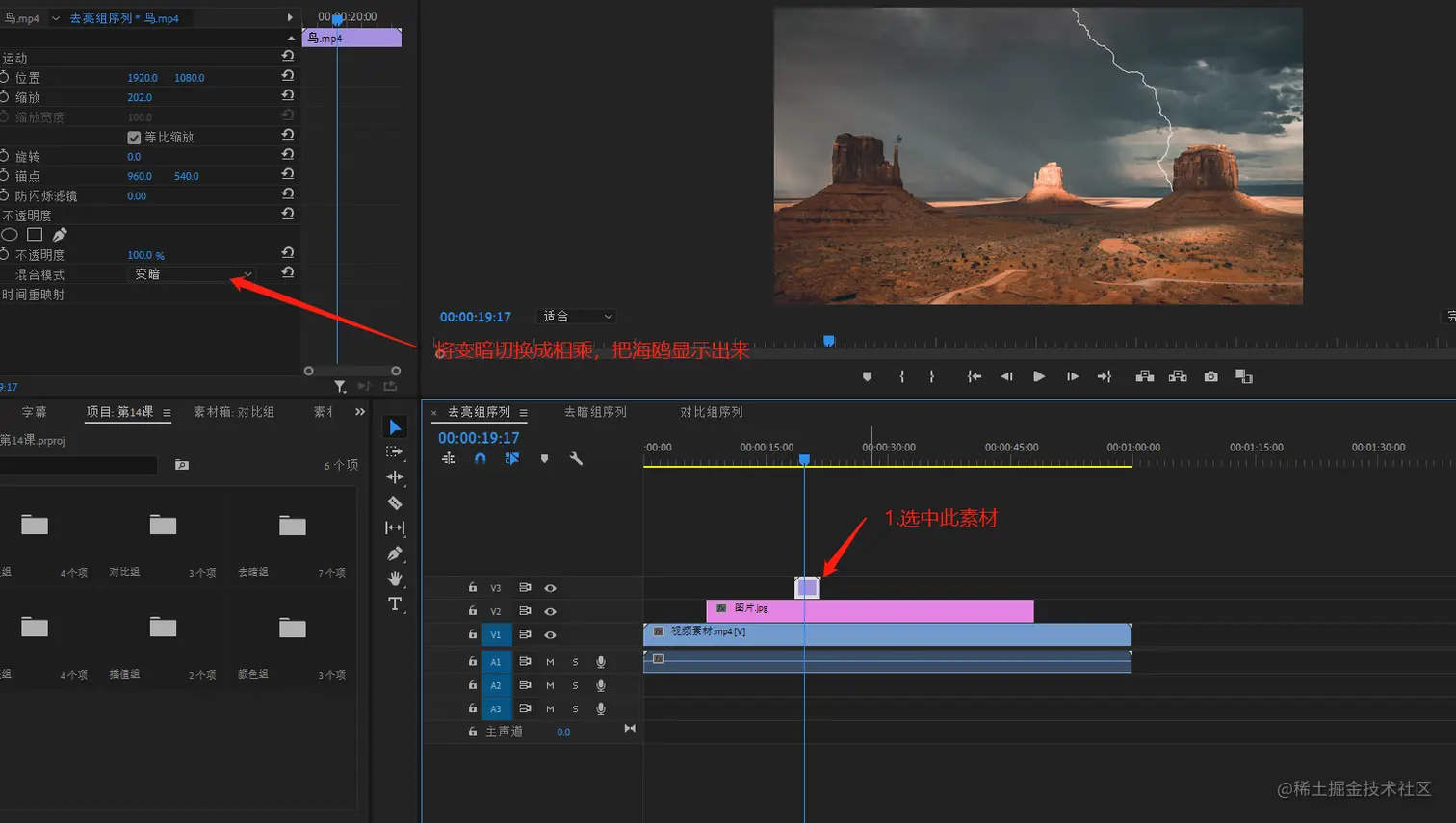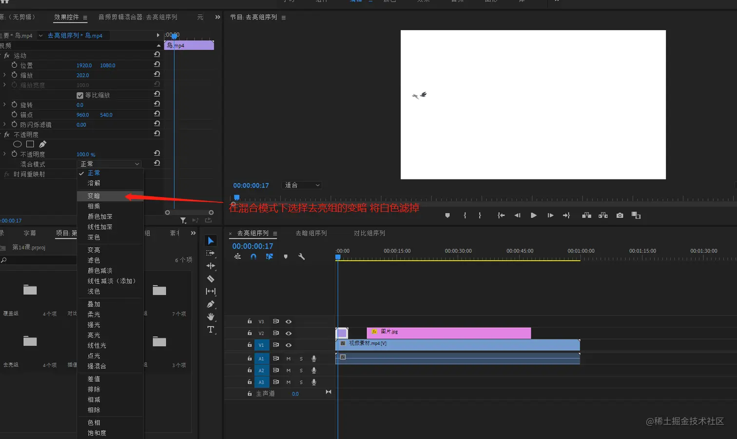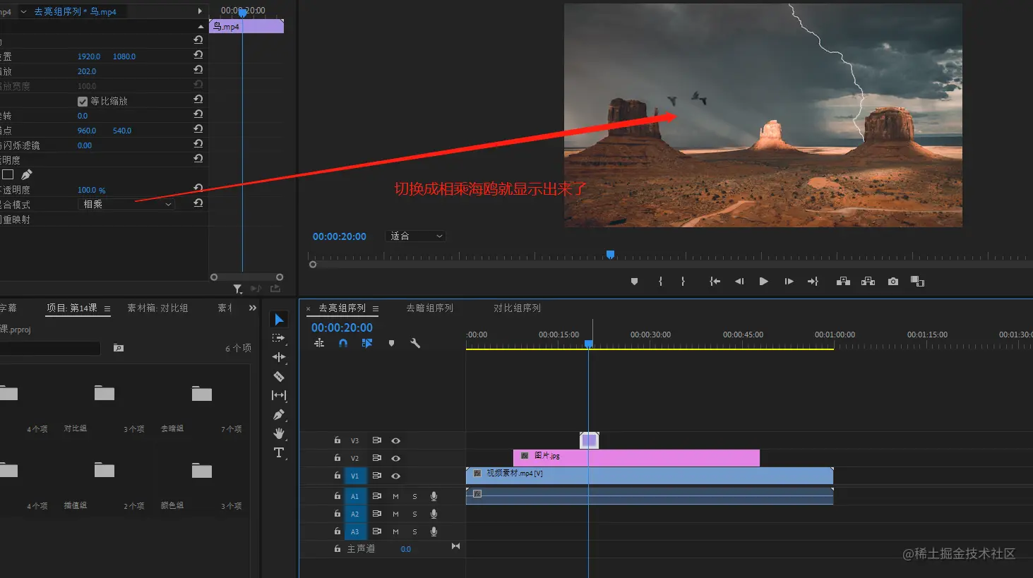 - 选中海鸥素材,将变暗切换成相乘,海鸥又重新显示出来了