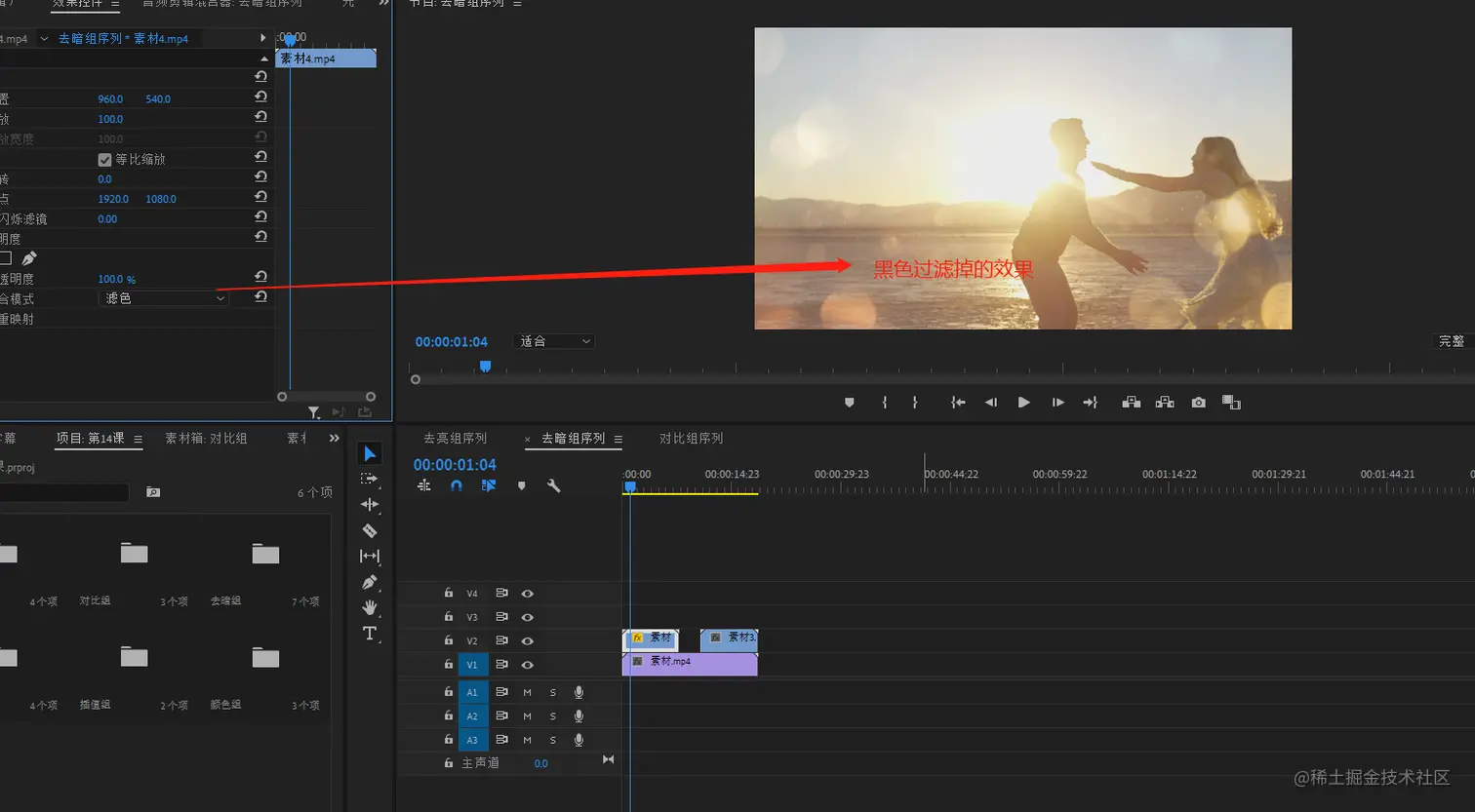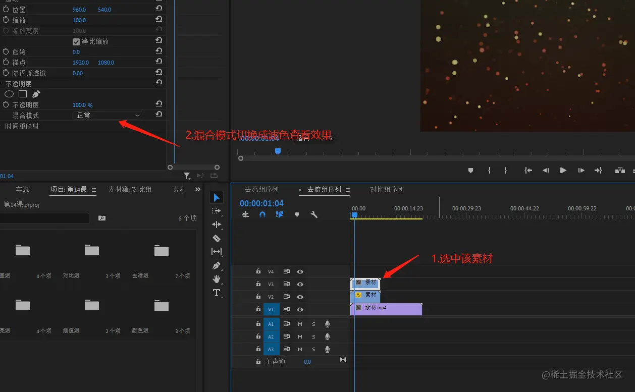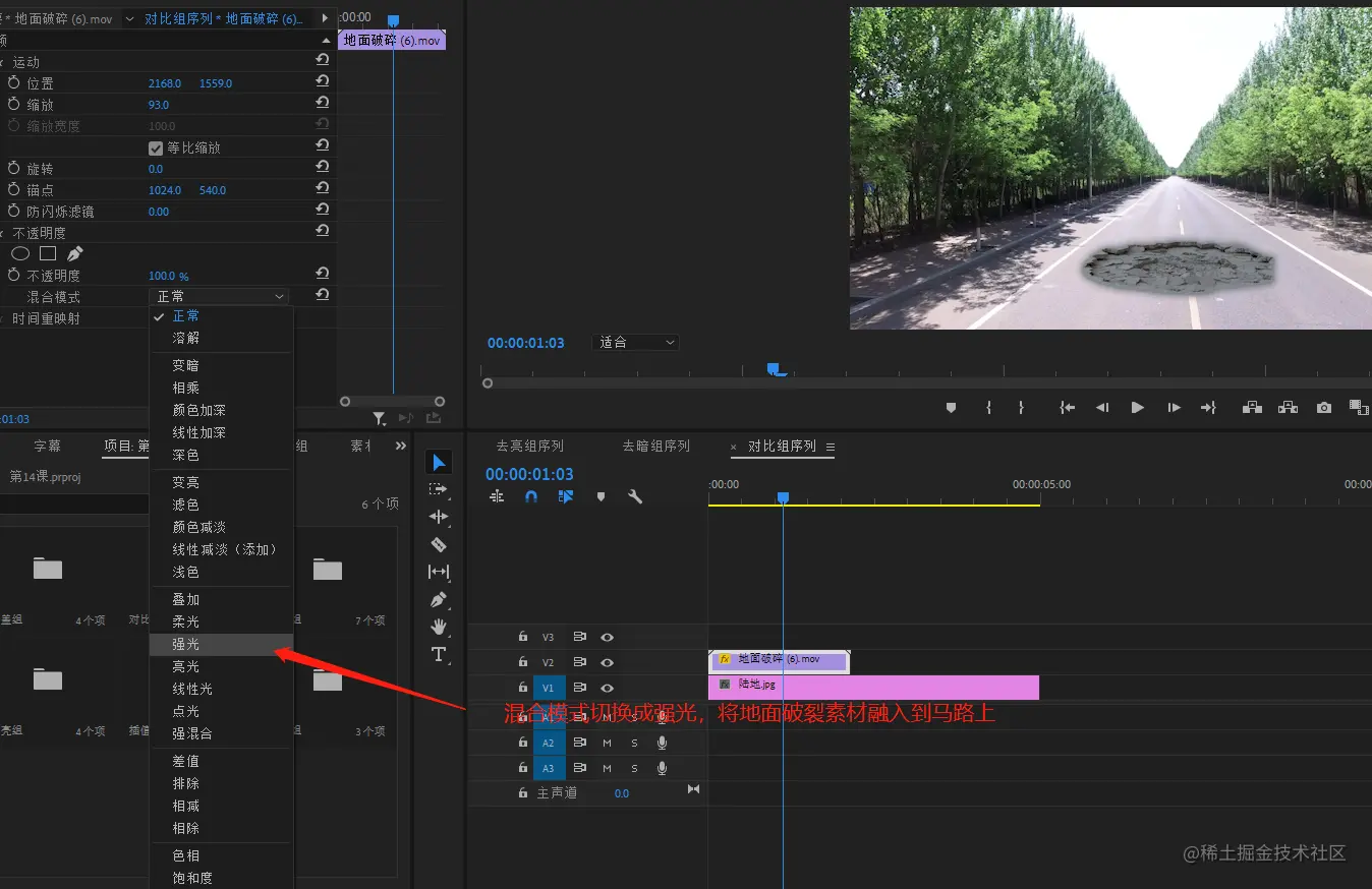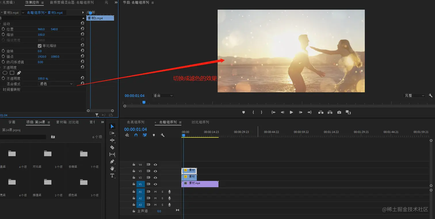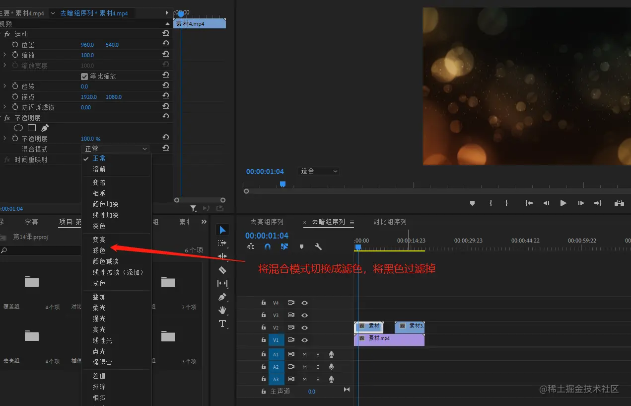 - 选中该素材片段,并把混合模式切换成滤色查看效果