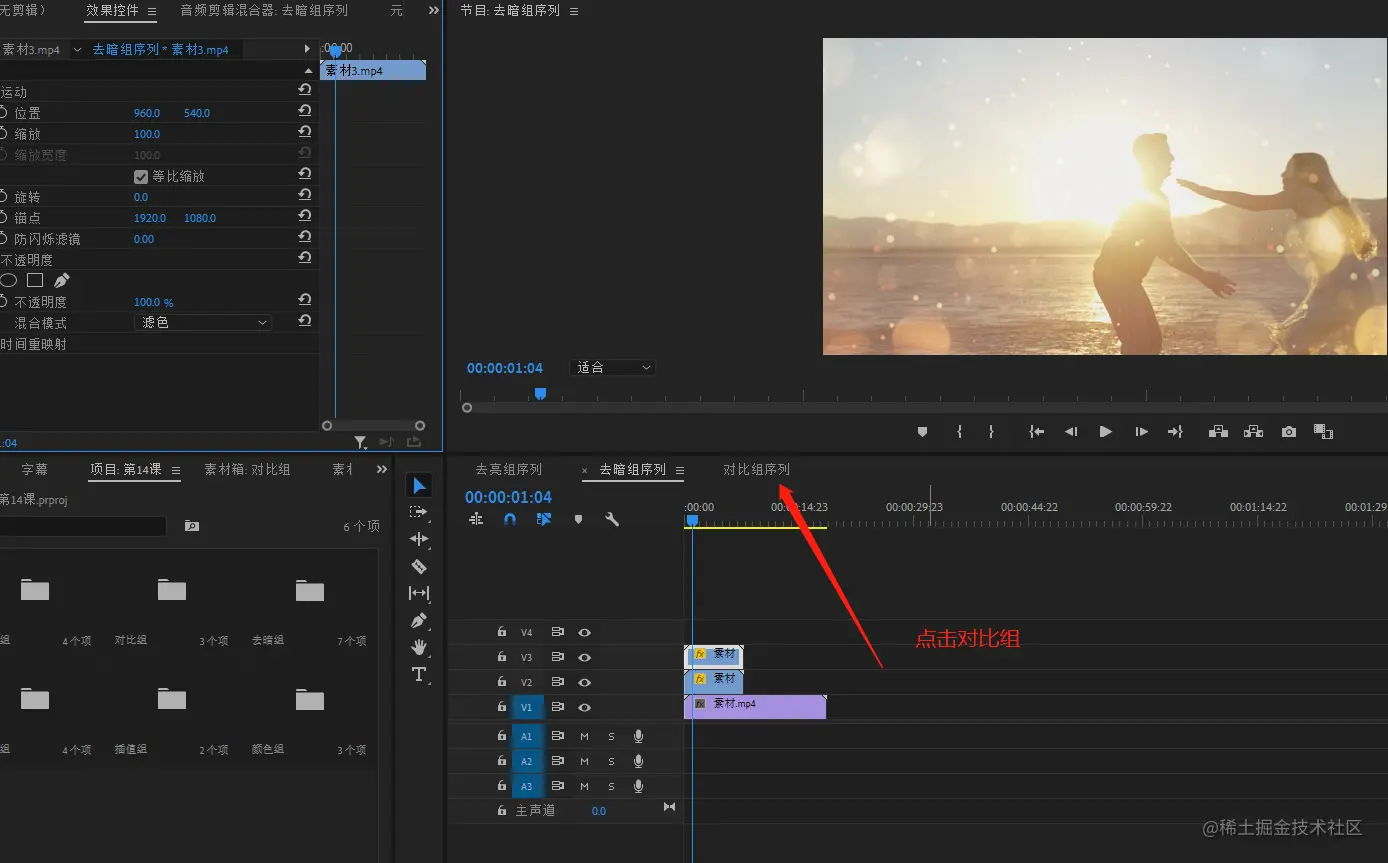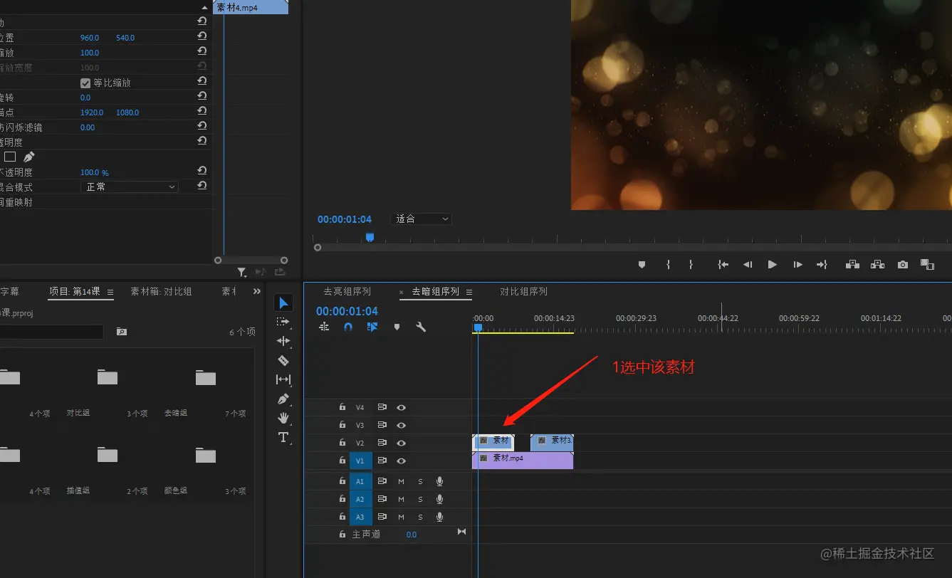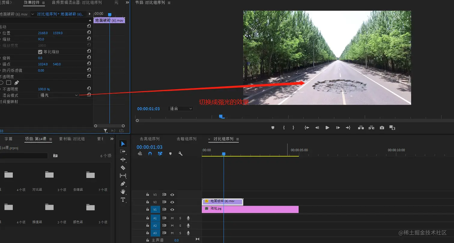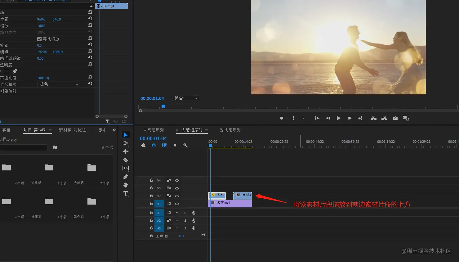 - 选中该素材片段,并把混合模式切换成滤色查看效果