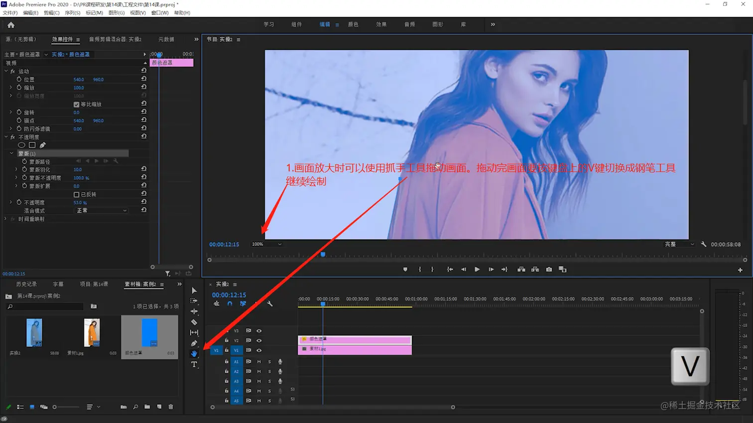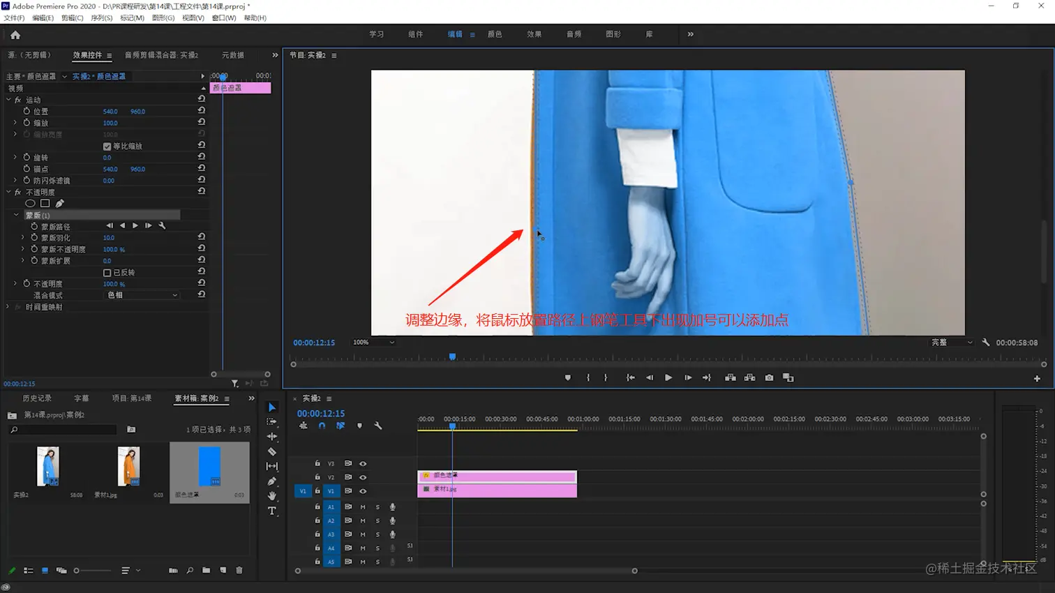 - 调整边缘,绘制颜色遮罩轮廓时如有部分边缘没有勾勒全,可以把鼠标移动到蒙版路径上当钢笔工具下出现加号,可以添加点,进行调整