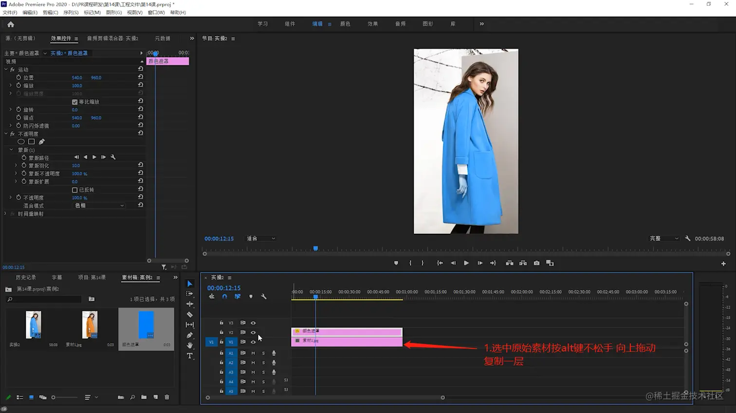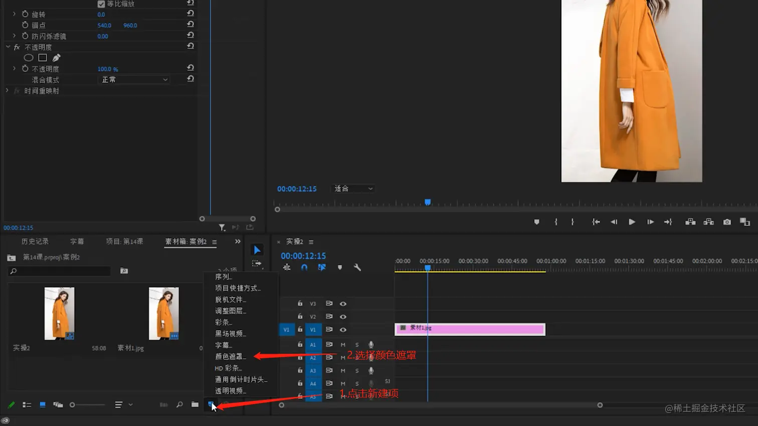 - 在项目面板中将颜色遮罩拖入到时间线面板上和素材1的时长进行匹配