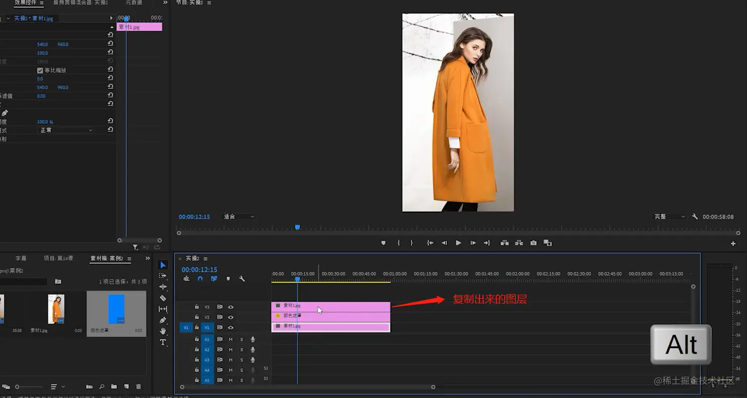 - 解决手部问题,选中素材1 按住键盘上的alt键不松手,向上拖动复制一层