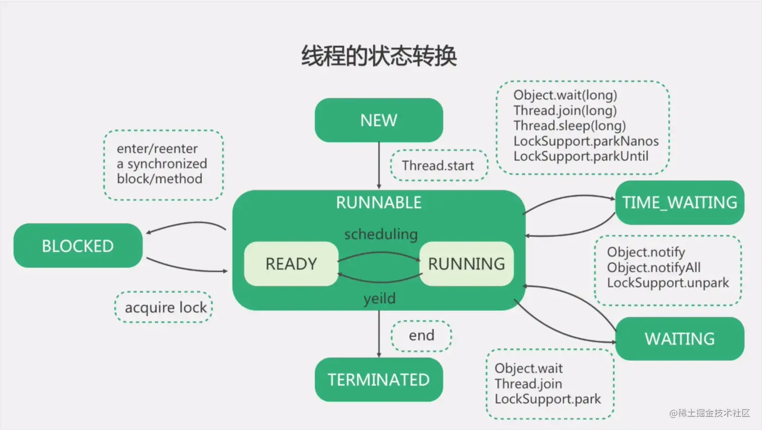 3. **运行状态:**就绪状态的线程被调度并获得CPU资源。