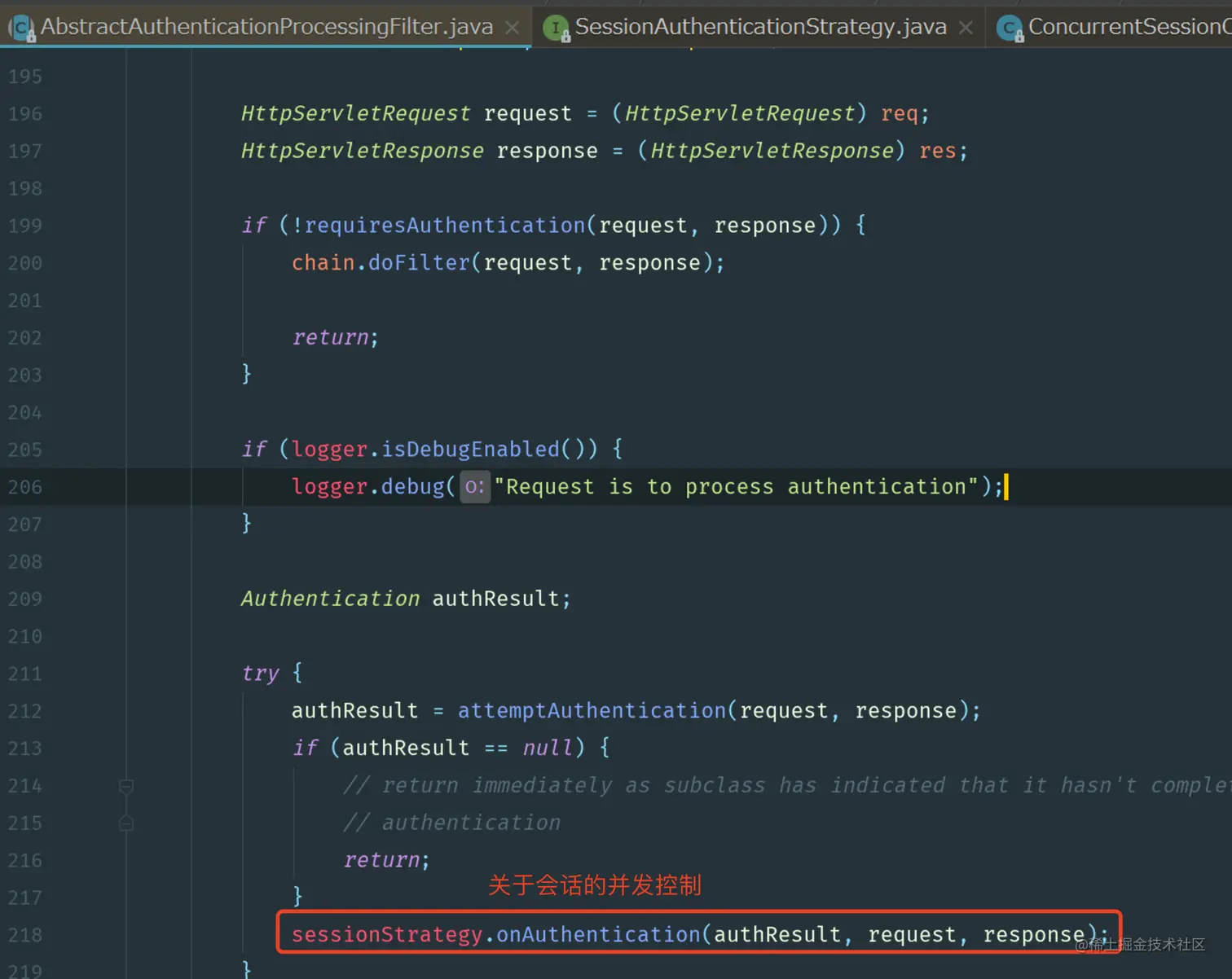 在这段源代码中我们可以看到,在调用完 attemptAuthentication方法执行完认证流程之后,接下来就会调用 sessionStrategy.onAuthentication 方法,这个方法就是用来处理 session 的并发问题的。