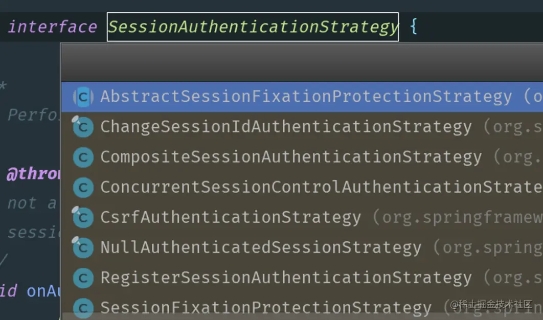 接着我们看看sessionStrategy对象所在类SessionAuthenticationStrategy的源码,内部定义了一个onAuthentication()方法 。