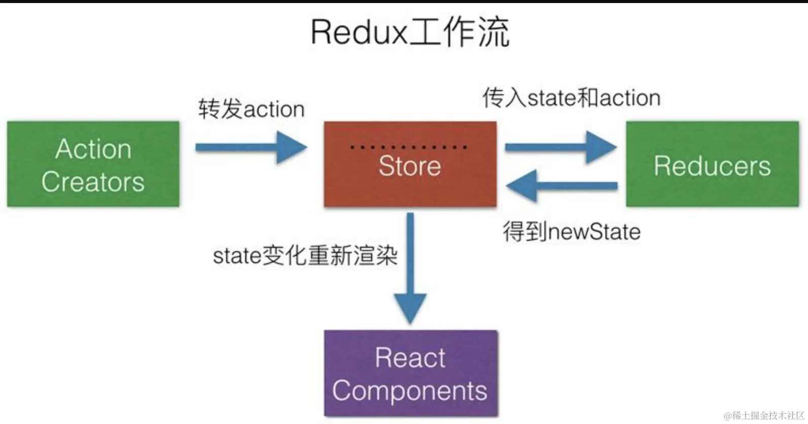 Redux是将整个应用状态存储到一个地方上称为store,里面保存着一个状态树store tree,组件可以派发(dispatch)行为(action)给store,而不是直接通知其他组件,组件内部通过订阅store中的状态state来刷新自己的视图