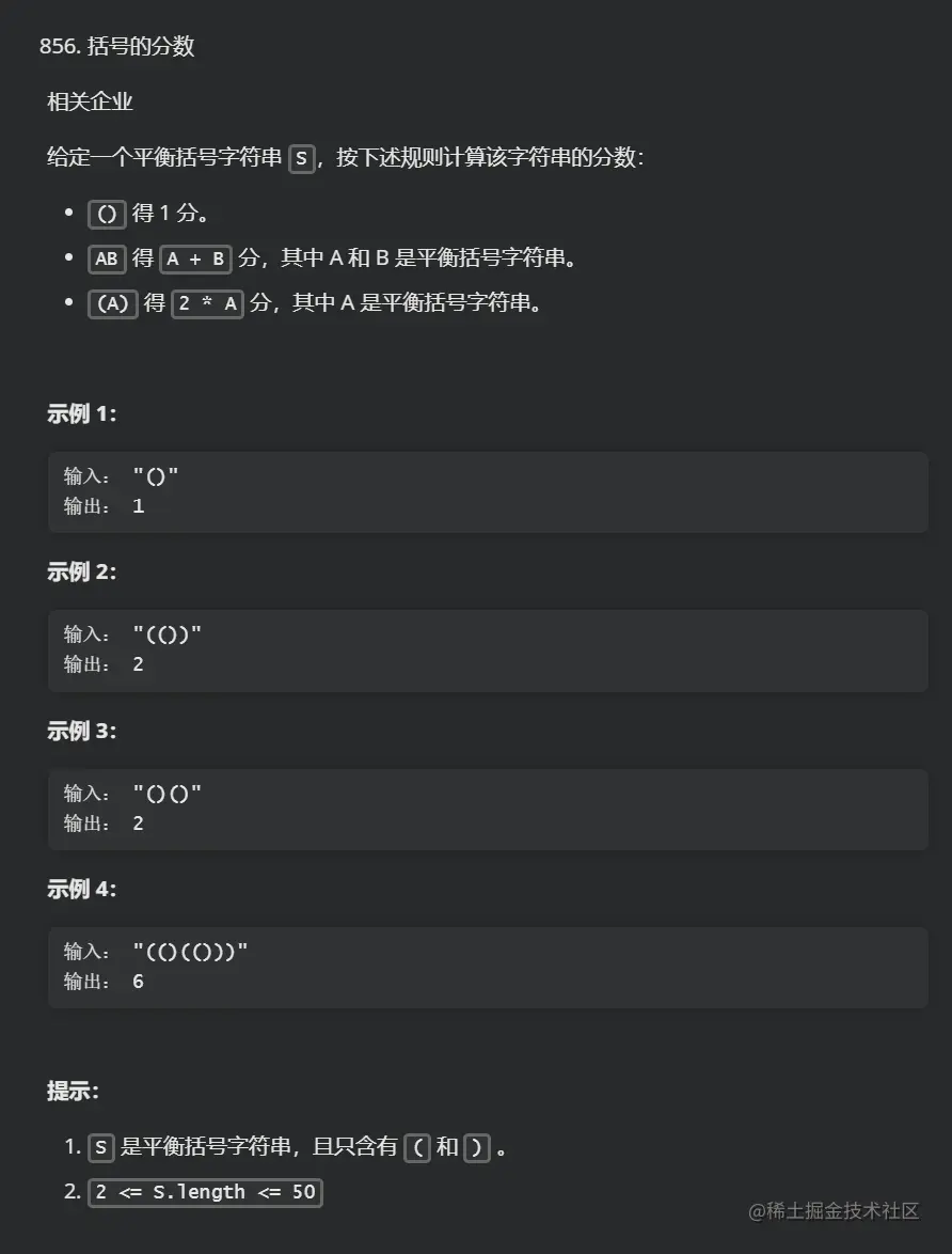 这是 力扣上的 856. 括号的分数:,难度为 中等。