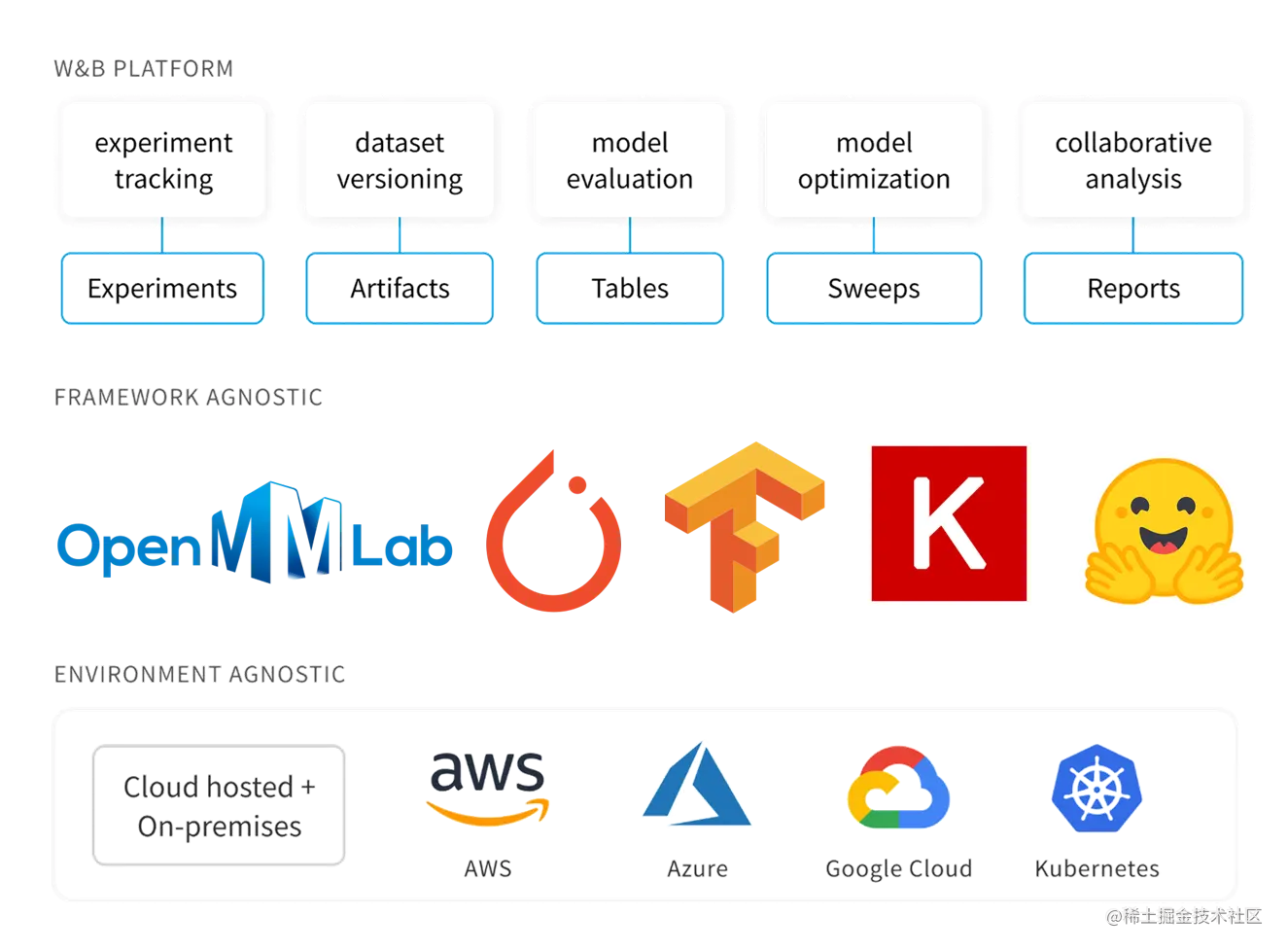 我们也与 Wandb 进行了合作,提供了对 Wandb 的支持,这里对 Wandb 进行一个简单的介绍。Wandb 是一个易用的实验管理工具,支持对实验的各个环节进行监控和数据收集,同时也支持多个开源框架与系统环境,其主要特性如下图所示。