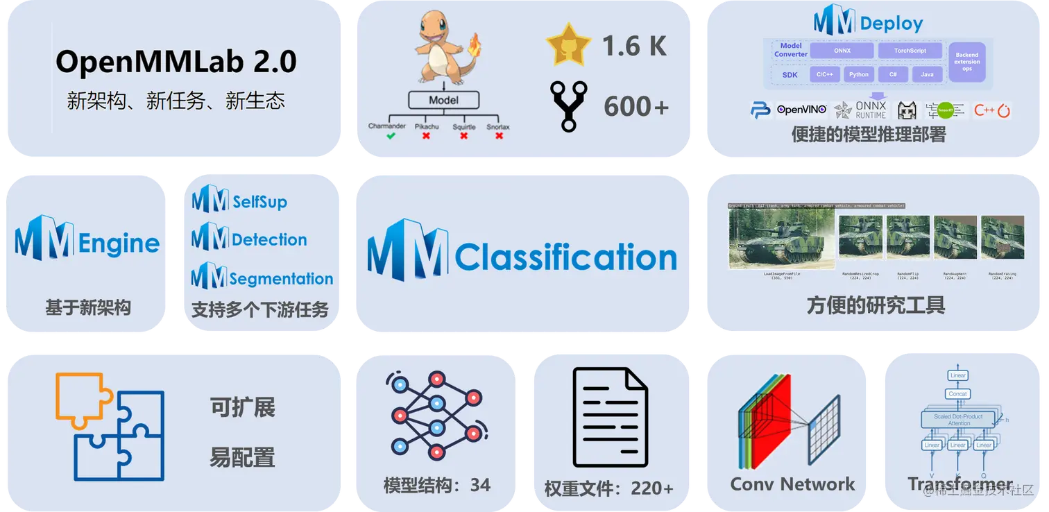 我们对 MMClassification 1.0 进行一个简单的总结,作为 OpenMMLab 2.0 的基础模型库,目前我们已经在整个开源社区获得广泛使用。基于全新的架构和生态,我们可以轻松支持多个下游任务,具有可扩展易配置的特性。同时,我们也提供丰富的算法模型,方便的研究工具,以及便捷的模型推理。