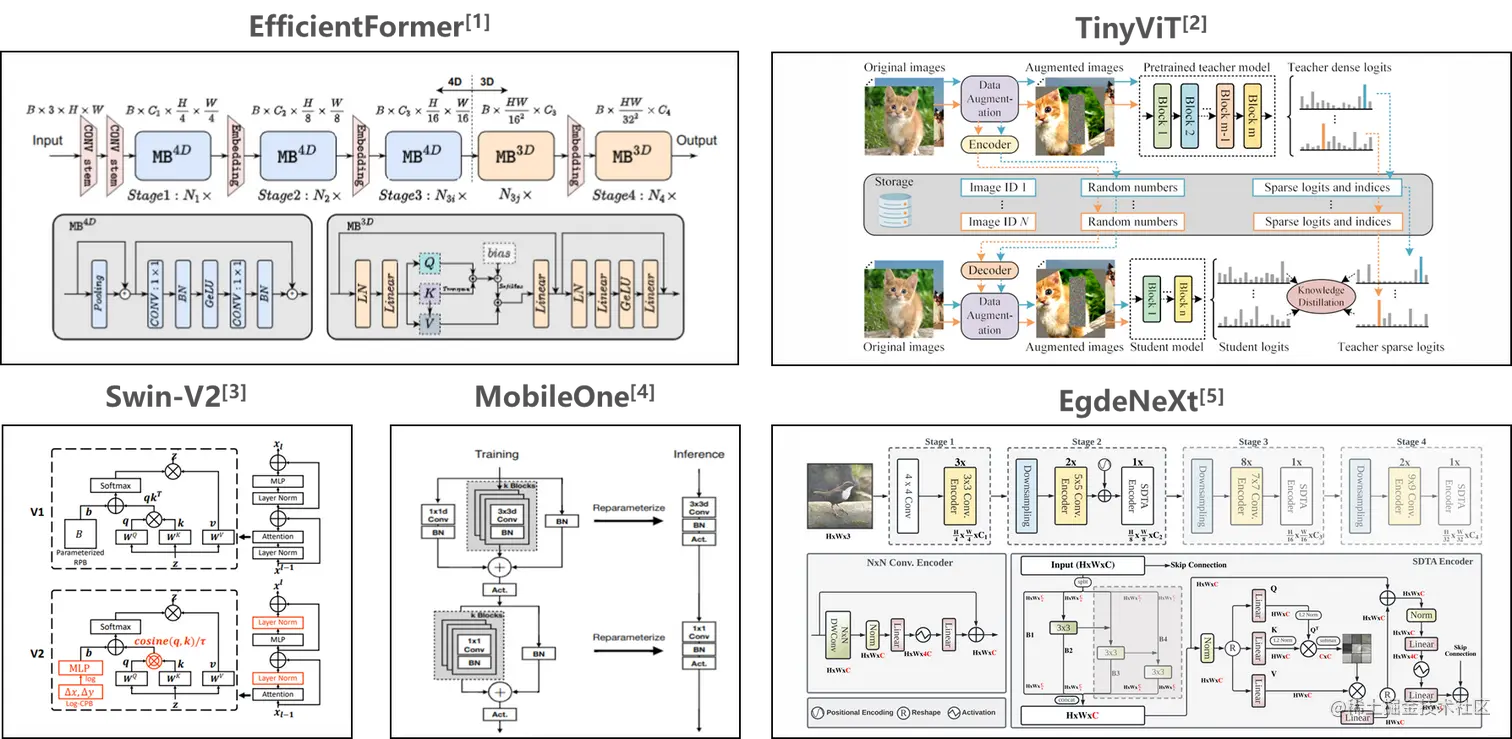我们也在近期对一些前沿算法进行了支持,如 Swin-V2, MobileOne, EdgeNeXt, EfficientFormer 等,它们的基本结构如下图所示: