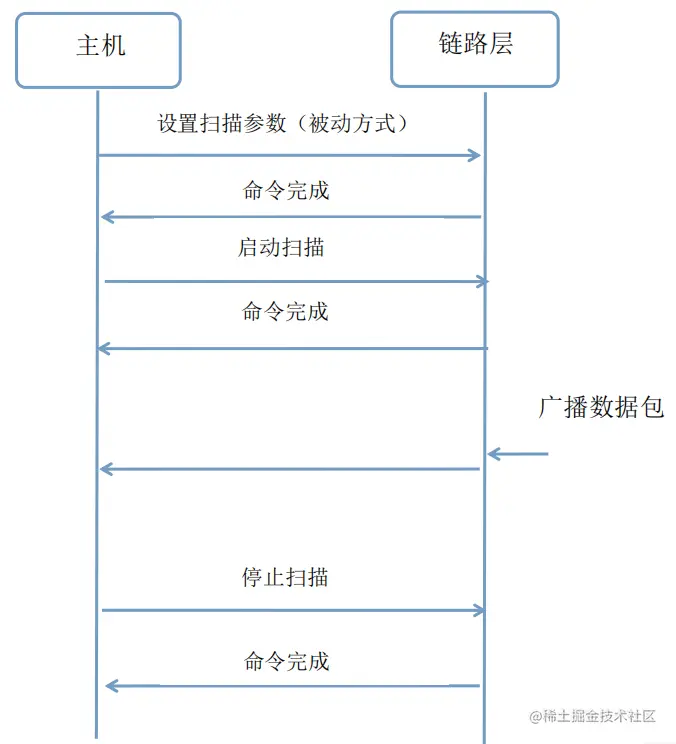 被动扫描:在被动扫描中,扫描设备应该仅仅去监听广播包,而不向广播设备发送任何数据。