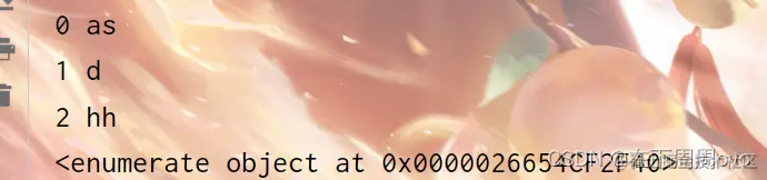 for i,k in enumerate( ['as','d','hh']): print(i,k) print(enumerate( ['as','d','hh']))