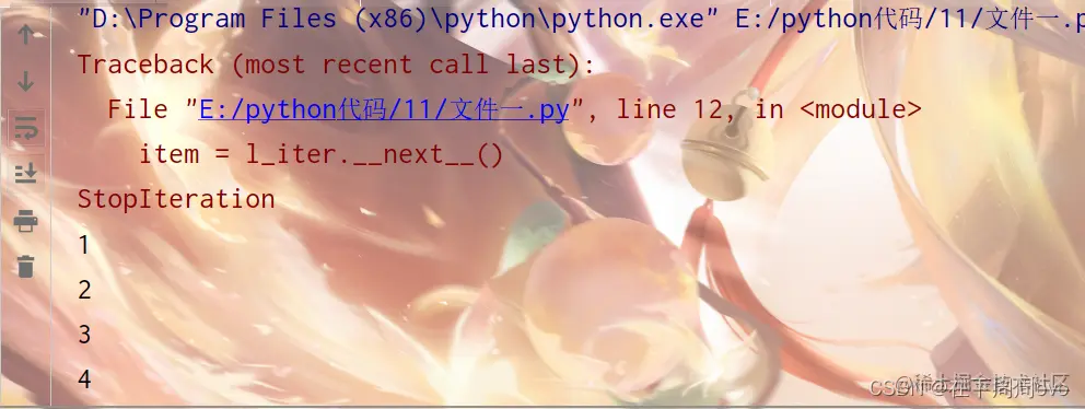 如果我们一直取next取到迭代器里已经没有元素了,就会抛出一个异常StopIteration,告诉我们,列表中已经没有有效的元素了。