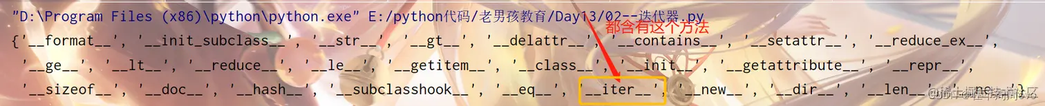 找出这些数据类型的公共内置使用方法发现都有'iter',可得出结论:含有'iter'内置方法的数据是可迭代的(iterable)。