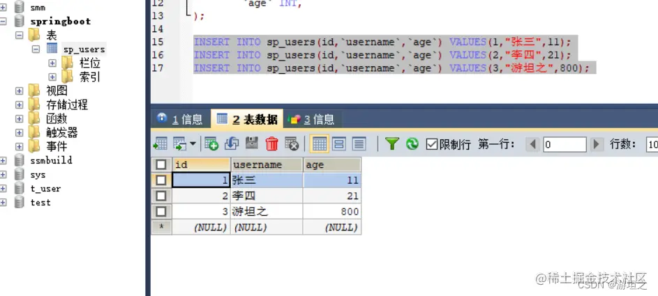 INSERT INTO sp_users(id,`username`,`age`) VALUES(1,"张三",11);