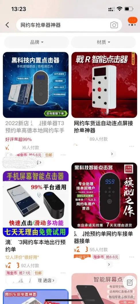 而在司机端,黑产工作室通过破解网约车平台的协议接口或者直接使用外挂设备帮助司机进行抢单。市面上流行过一种预约单神器,可以帮助司机抢单。这种外挂模拟真人手指点击抢单,不涉及任何打接口和破解App后台协议的行为,所以这种工具就非常难防,从行为层面和数据层面来看都与真人差别不大。在淘宝上搜索“网约车抢单器神器”,便出现了针对滴滴、T3出现等平台的抢单工具。