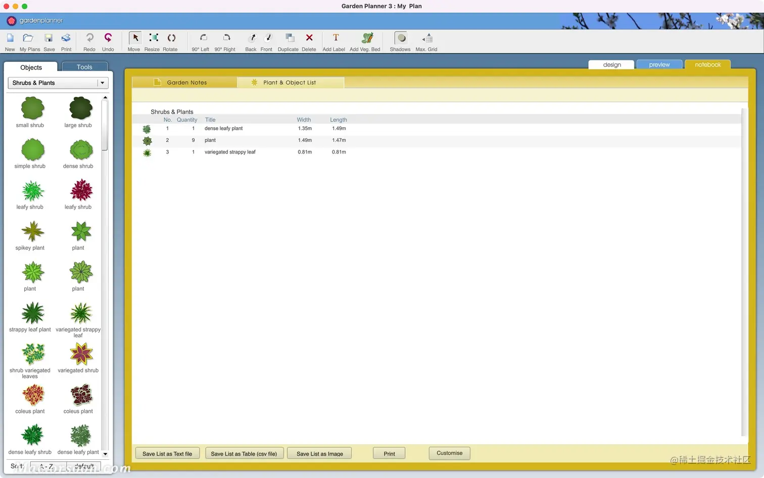 然后生成高质量的彩色 图像或打印出您的设计。创建所有植物和对象的列表,并添加您自己的花园笔记