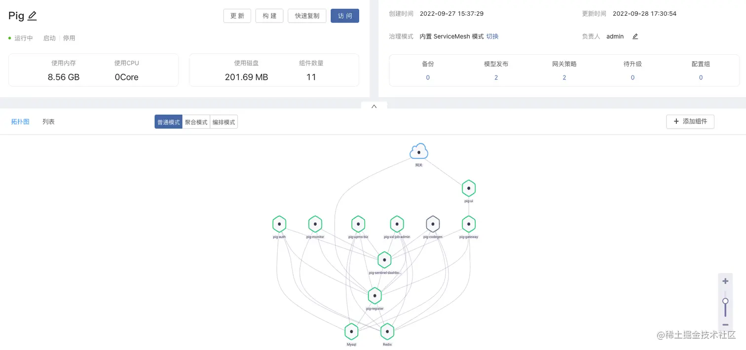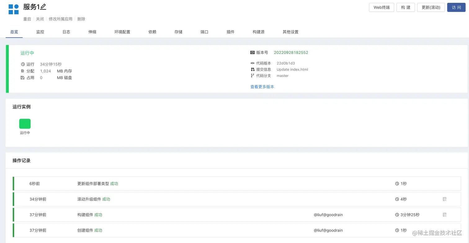 支持对应用、组件级别的管理,支持应用批量启动、重启、更新、关闭、删除以及组件的操作,支持应用和组件级别的环境变量、版本回滚等。