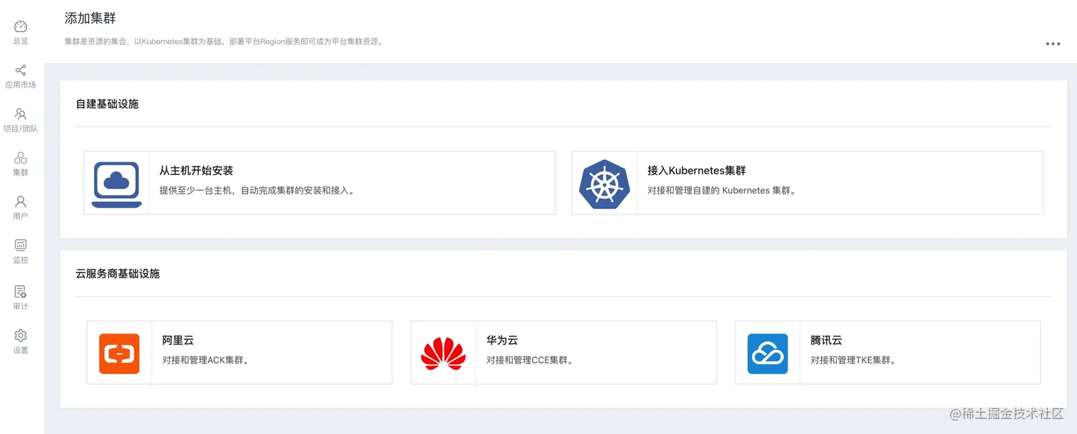 支持对接多个 K8s 集群,支持各种云厂商托管 K8s 集群以及私有云、混合云等。支持用户通过控制台添加或删除集群,支持跨集群应用分发。