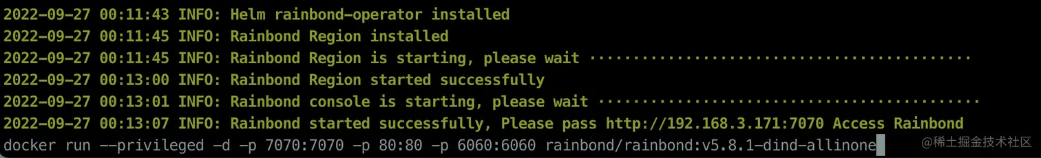 docker run --privileged -d -p 7070:7070 -p 80:80 -p 6060:6060 rainbond/rainbond:v5.8.1-dind-allinone