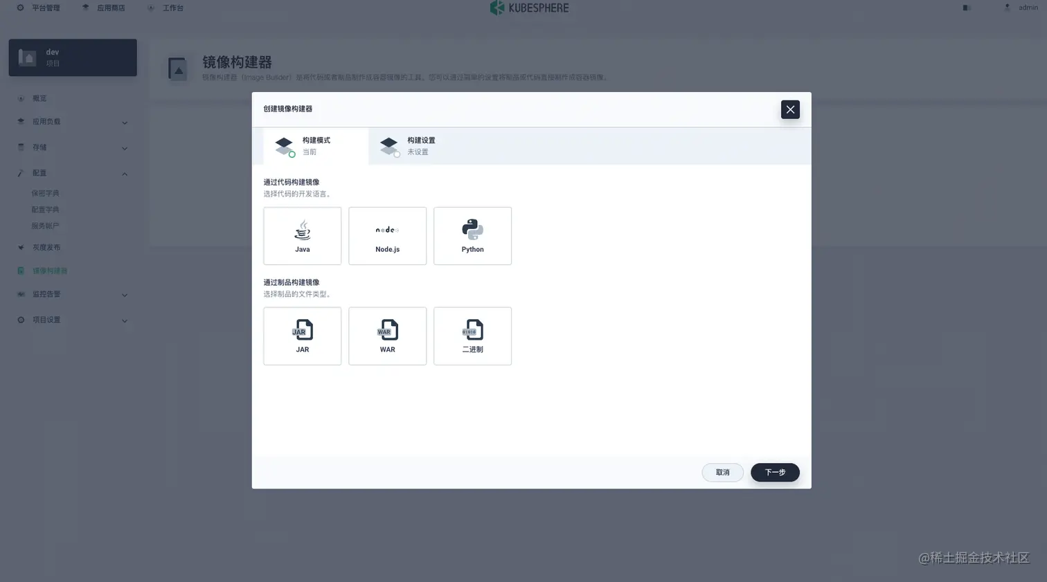 KubeSphere采用 Binary-to-Image (B2I) 标准工作流将二进制打包成镜像,并部署在 Kubernetes 集群中。支持通过 Jar、War、二进制