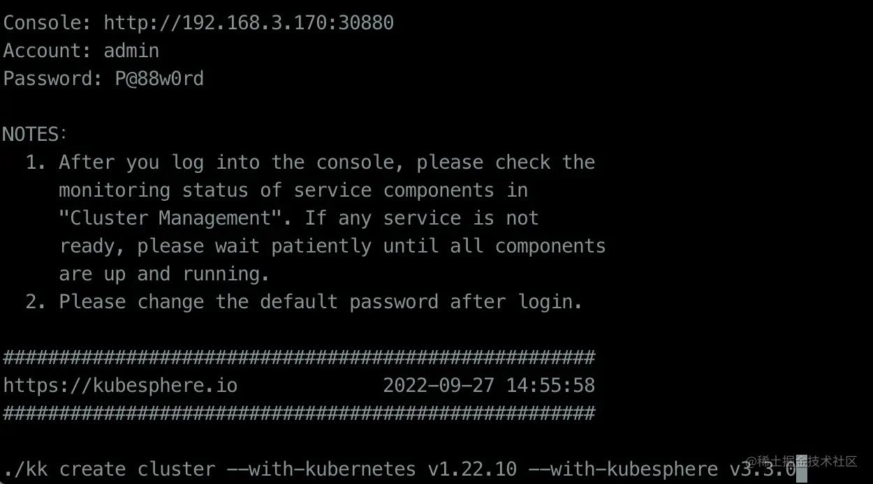 ./kk create cluster --with-kubernetes v1.22.10 --with-kubesphere v3.3.0