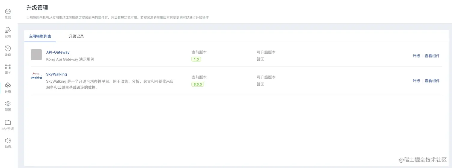 支持基于 Rainbond 应用市场一键安装和一键升级,升级会包含应用模型内所有元数据,包括依赖关系等。