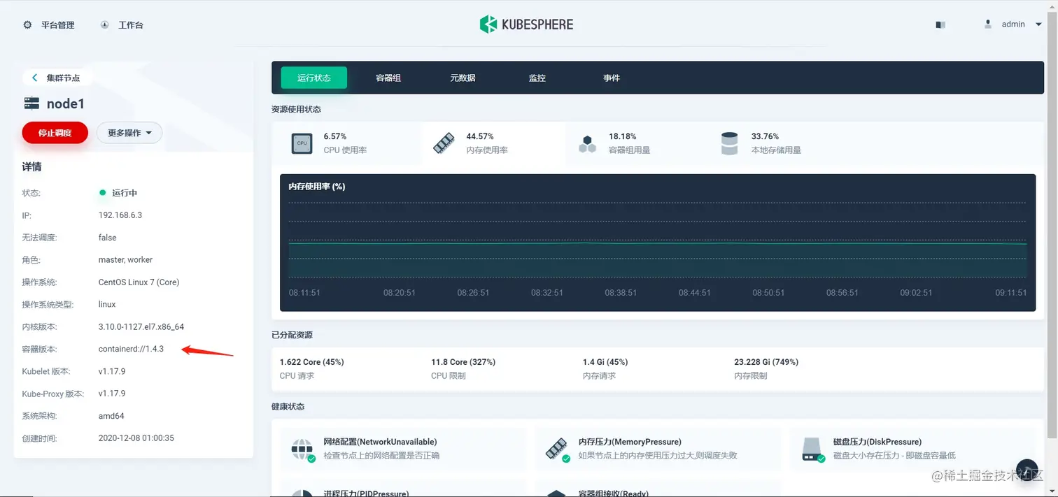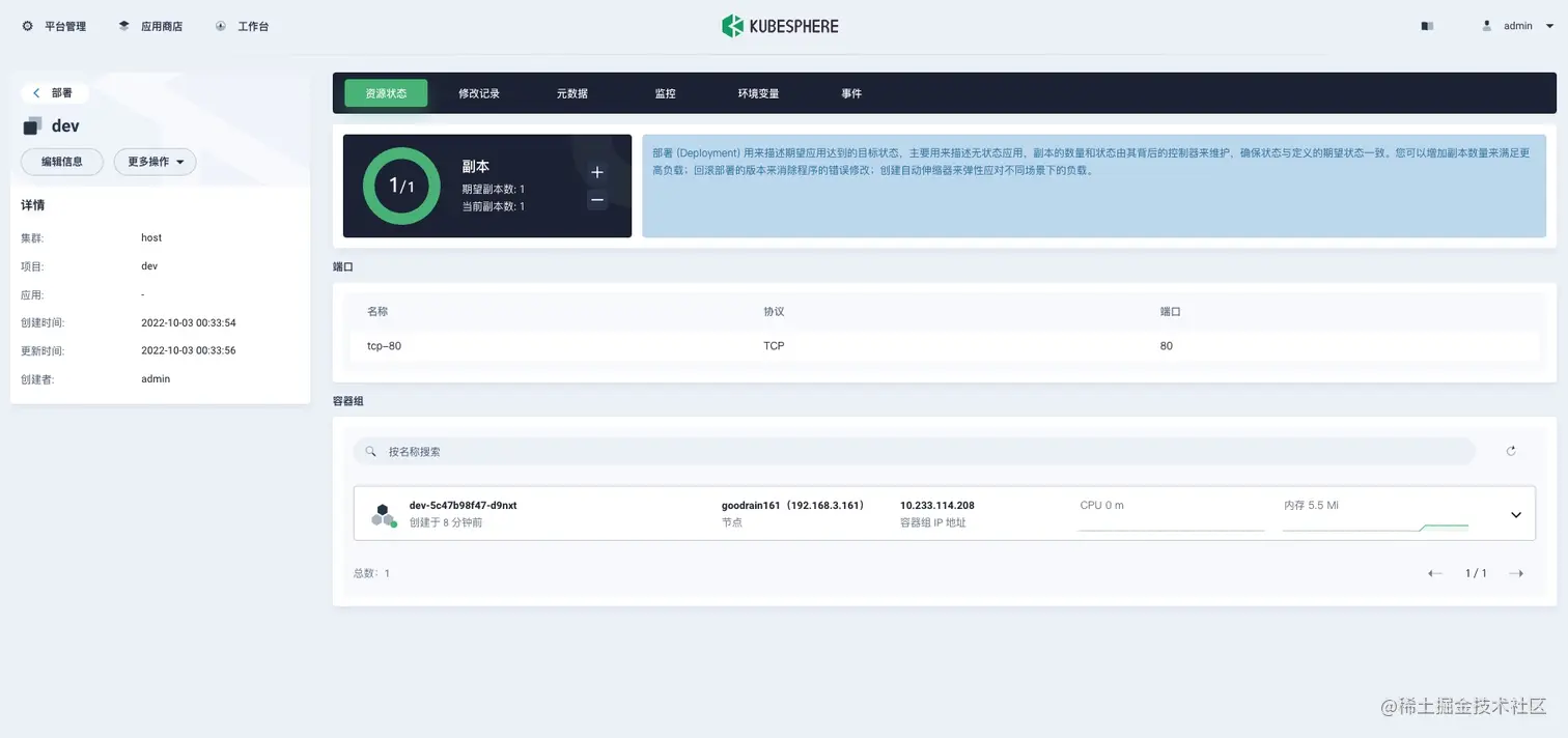 KubeSphere和Rainbond安装都很简单。 KubeSphere 自研的 KubeKey 安装工具,在服务上安装 K8s 和 KubeSphere 很方便。KubeSphere 的可拔插组件这个设计还蛮好的,Allinone安装之后有 5 个 Pod 左右,能满足基本运行需求,需要其他功能就通过可拔插开启,开启所有组件后 Pod 大概 60 个左右。Rainbond 能支持在 Mac M1 Docker Desktop 上安装,这个安装体验还蛮好的可以在本地开发,Rainbond 启动后 Pod 大概15个左右,内存占用1G 左右。