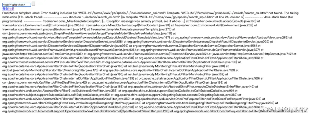 因为 WEB 页面本身就是 HTML 写的,所以在输入框中输入 HTML 语言片段的话,如果没有进行处理,页面可能会有报错信息。就像图中展示的这样。