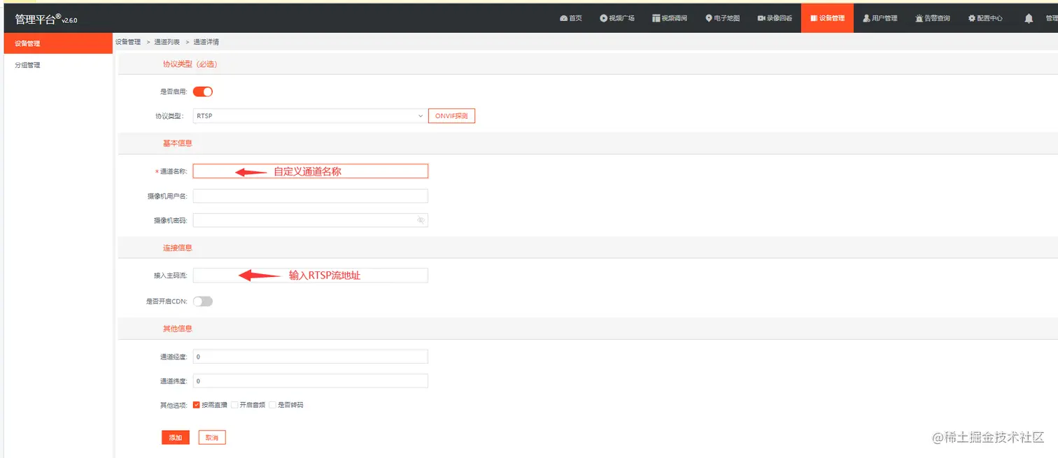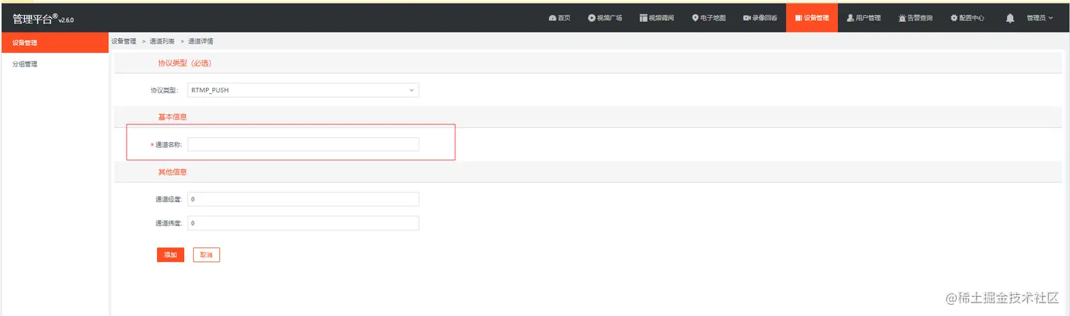 在【通道管理】中,添加通道,如图: