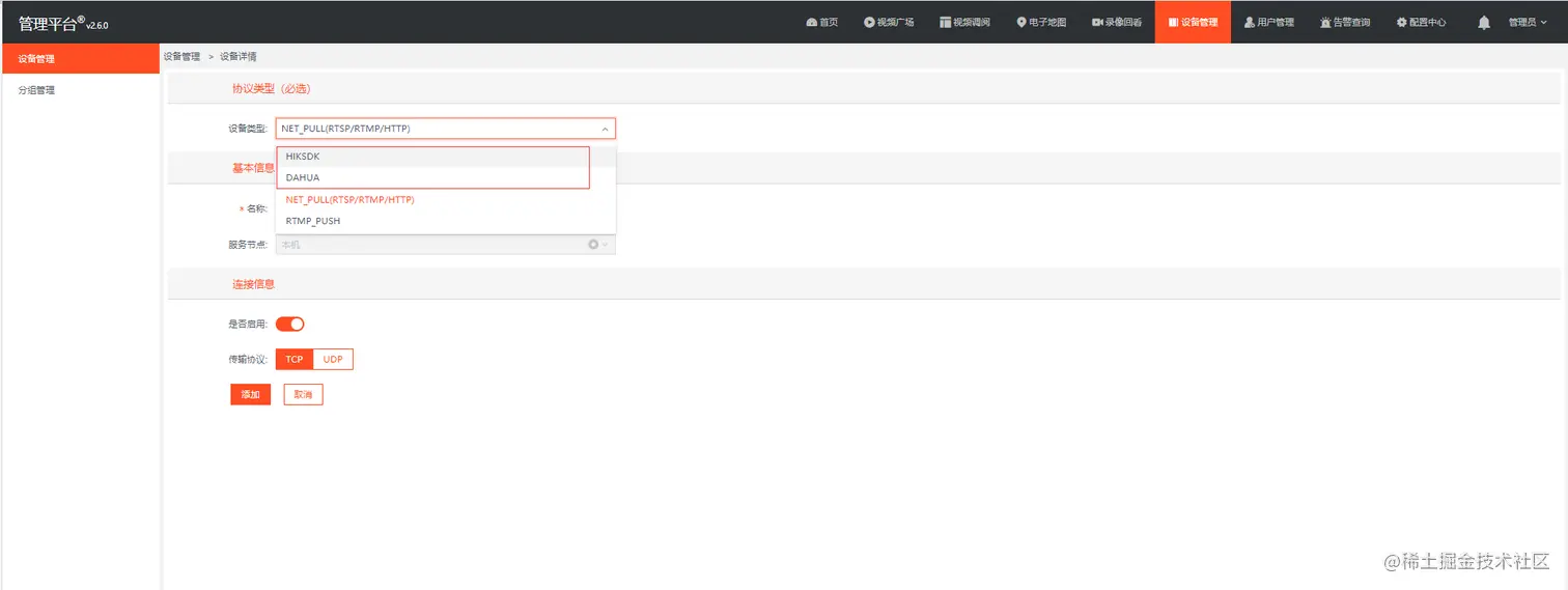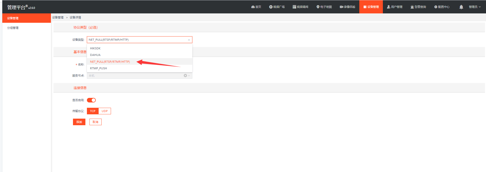 在EasyCVR平台进行如图配置,打开【设备管理】,在【设备类型】中选择NET_PULL(RTSP/RTMP/HTTP)协议: