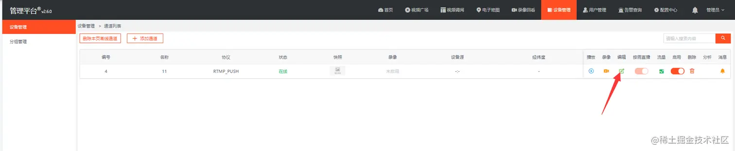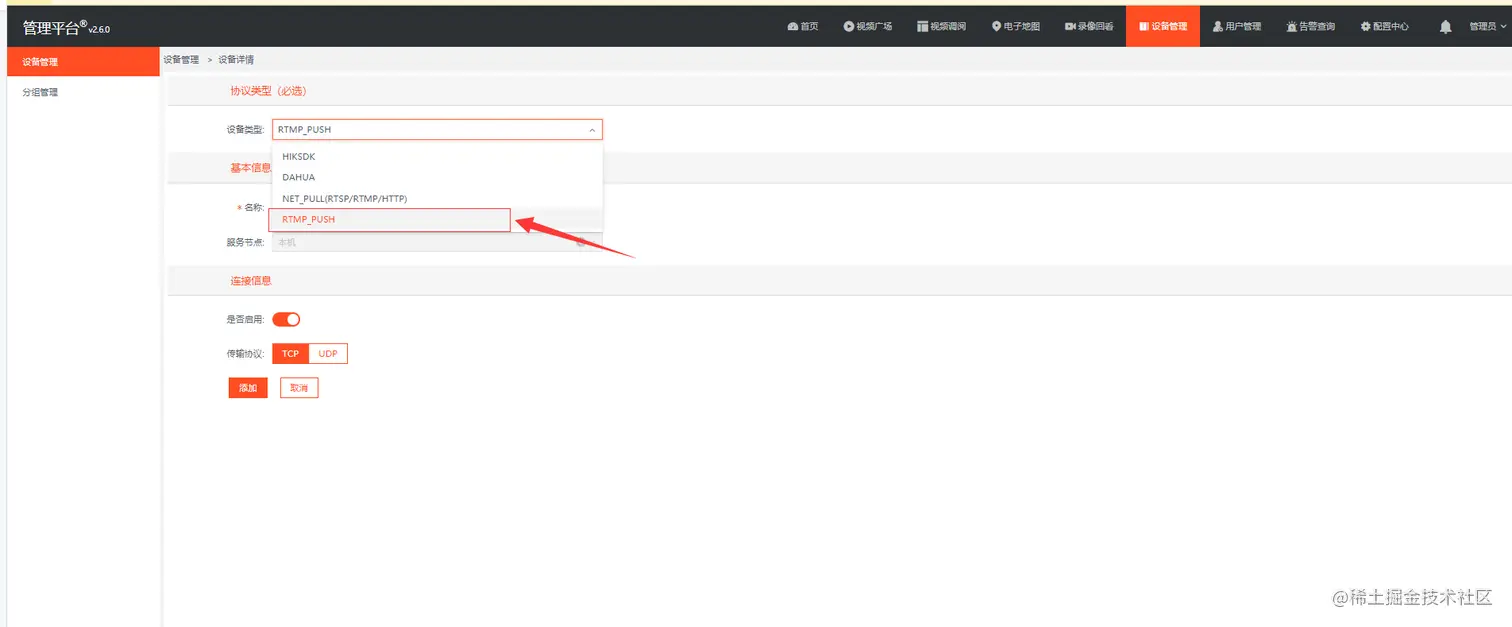 在EasyCVR平台进行如图配置,打开【设备管理】,在【设备类型】中选择RTMP_PUSH: